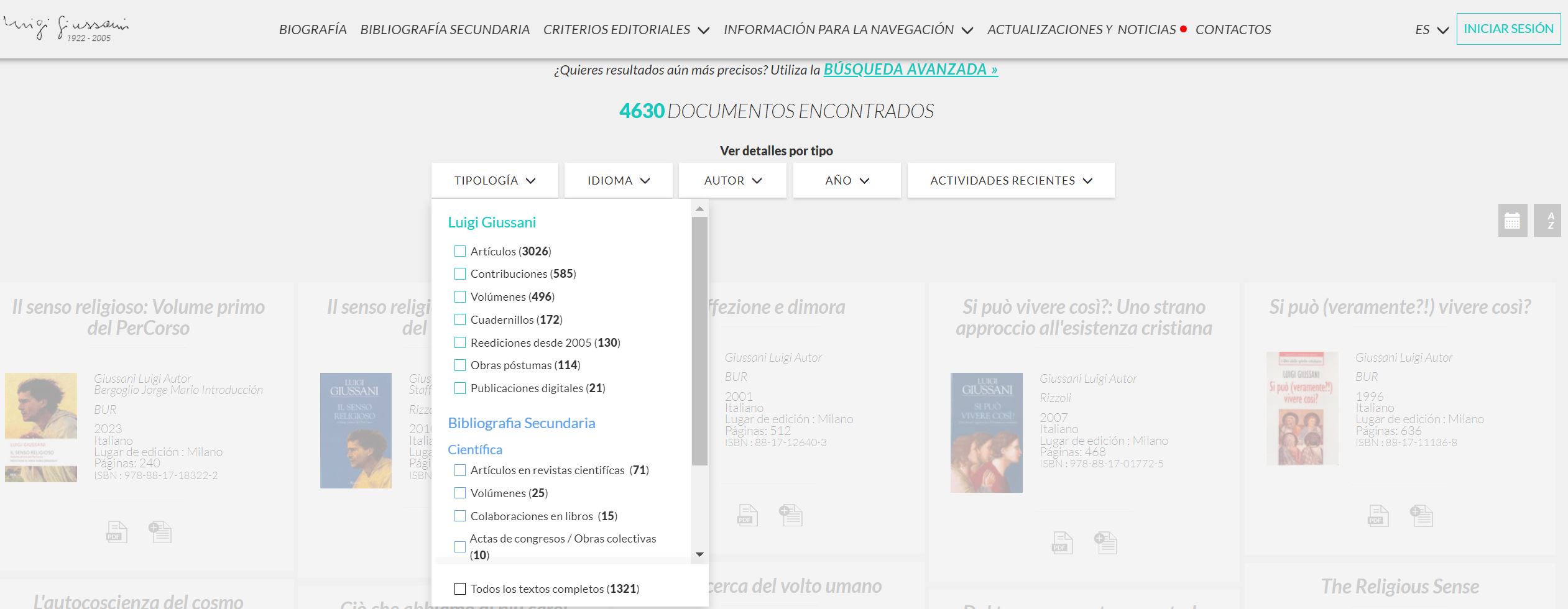 En la página principal, los textos de las secciones Publicaciones de Luigi Giussani y Bibliografía secundaria tienen un diseño gráfico diferente.